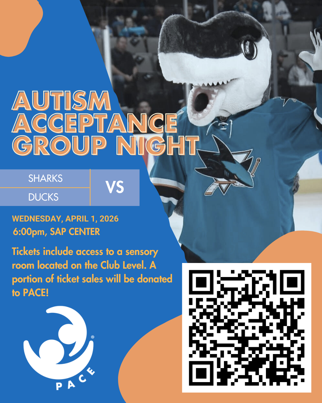During the game, a sensory room (designed by PACE) will be open to families and individuals on the Club Level. The sensory room will offer a quiet area, dimmed lighting, and sensory-friendly activities. You will also have access to restrooms and food on the Club Level! The San Jose Sharks are committed to ensuring a fun and inclusive night for all families in attendance.
